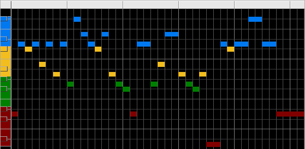 Here is a color-coded map of the bins illustrating the pitch distribution. The x-axis is time, the y-axis is pitch.