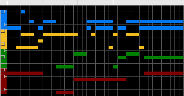 | It contains exactly the same number of notes as Example 1 along with an identical pitch distribution by bin, yet it sounds entirely different. Here is the color-coded bin map. | |
