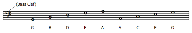 Notes can also appear above or below the staff and are written using short lines (ledger lines) and their associated spaces. The clef symbol indicates how a given system of staves should be read. The example below shows the note assignments for the commonly used treble clef and the bass clef.