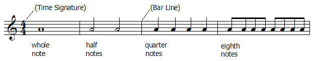 | The duration of a note is indicated by a standard set of symbols and is measured relative to a beat determined by the time signature. The time signature governs how notes are grouped. These groupings are demarcated by vertical lines (bar lines) that divide the staves into measures. Basic duration symbols are shown here.