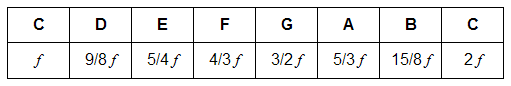 They devised various means for arranging the pitches of the seven most consonant tones (those that best complemented each other) to occupy the same octave and thereby constructed a scale. The notes obtained in this fashion are named according the first seven letters of the alphabet. Because they represent integer relationships, each note in the scale can be defined relative to any starting note, or tonic, by a simple ratio. Here is an example of a harmonically derived scale showing the ratios between adjacent notes.
