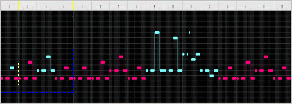 This is a graph of the actual bass line. The x-axis is time and the y-axis is pitch. The light blue segments correspond the first instance of a high region at each of the three scales of measurement. The yellow and blue dashed lines mark the first measure and the first four measures, respectively.
