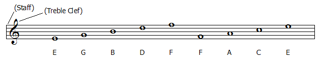 Notes can also appear above or below the staff and are written using short lines (ledger lines) and their associated spaces. The clef symbol indicates how a given system of staves should be read. The example below shows the note assignments for the commonly used treble clef and the bass clef.